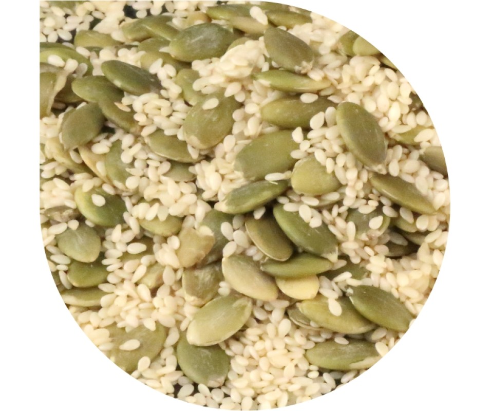 PAN DEK SESAMO E ZUCCA è una miscela di semi di sesamo e semi di zucca. Una combinazione molto caratteristica. I semi di zucca, estratti dall’omonimo frutto, sono fatti opportunamente seccare mentre i semi di sesamo sono essiccati e poi decorticati. Ambedue sono ricchissimi di sali minerali. È anche la decorazione utilizzata nel nostro prodotto denominato Zuccalin.